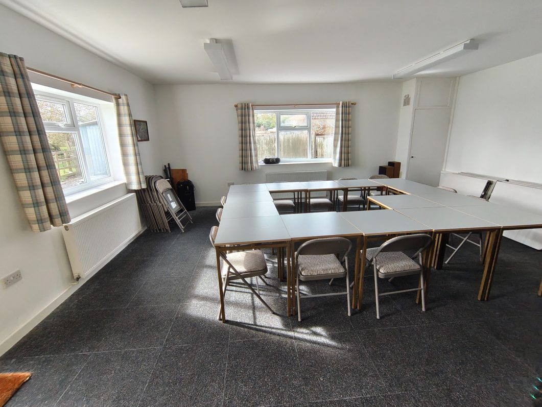 A well lit, fully carpeted meeting room with outside access to the car park, two large double glazed windows and a large hatch to the kitchen area and double door access to main hall.